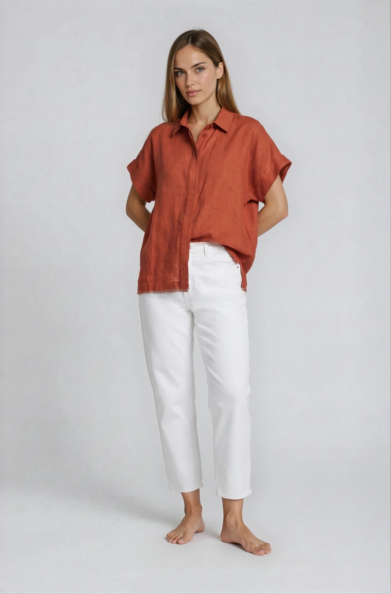 Camicia in 100% lino, leggera e fresca sulla pelle. Il volume morbido, il colletto classico e la manica corta ampia la rendono un capo pratico e raffinato, ideale da abbinare a pantaloni bianchi, denim o capi in lino per un look estivo essenziale.