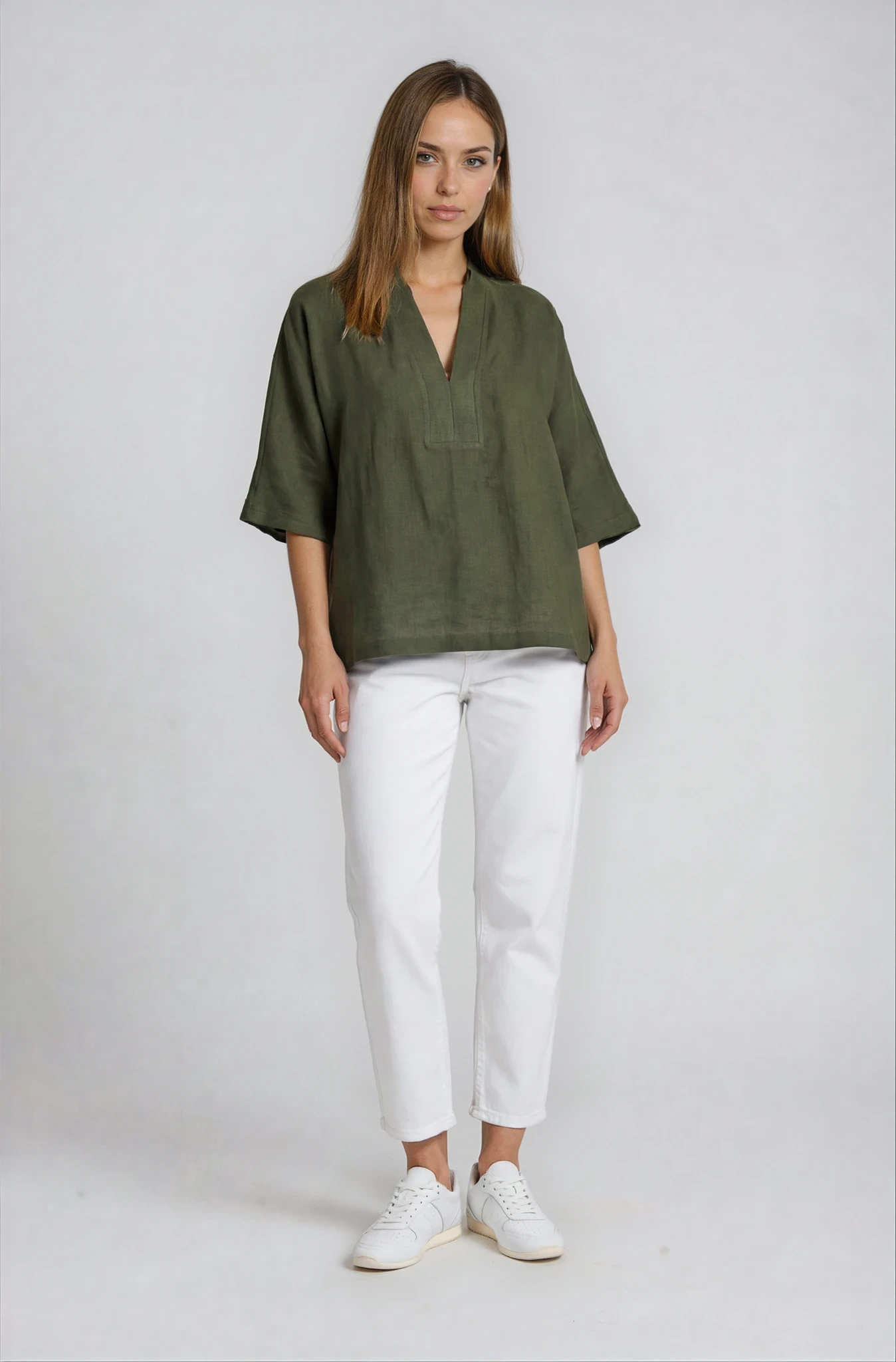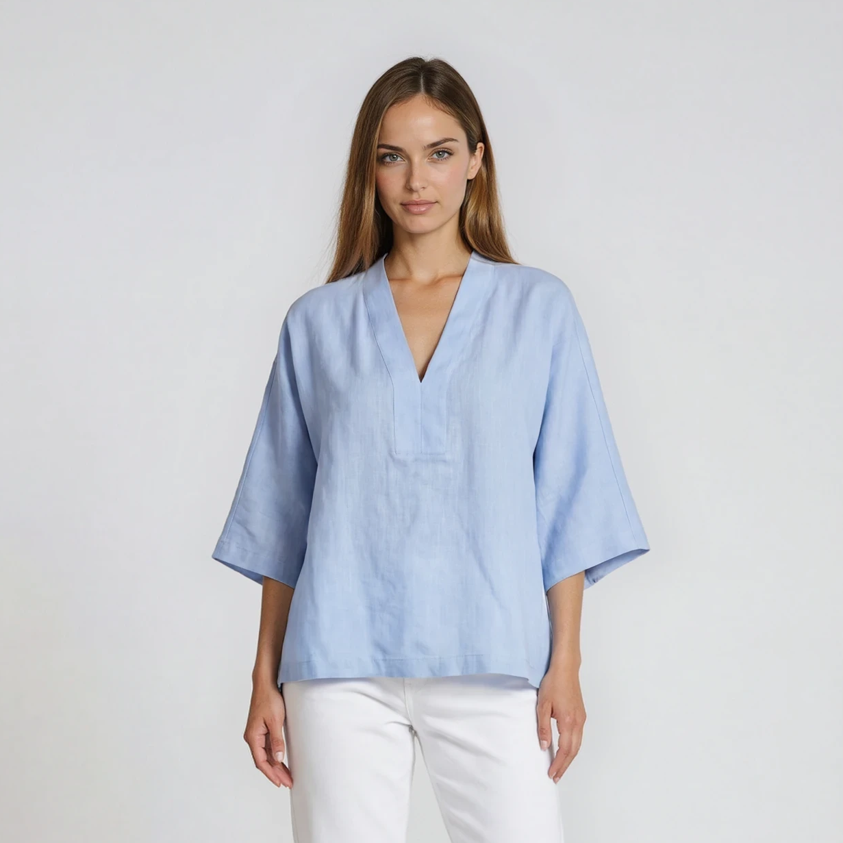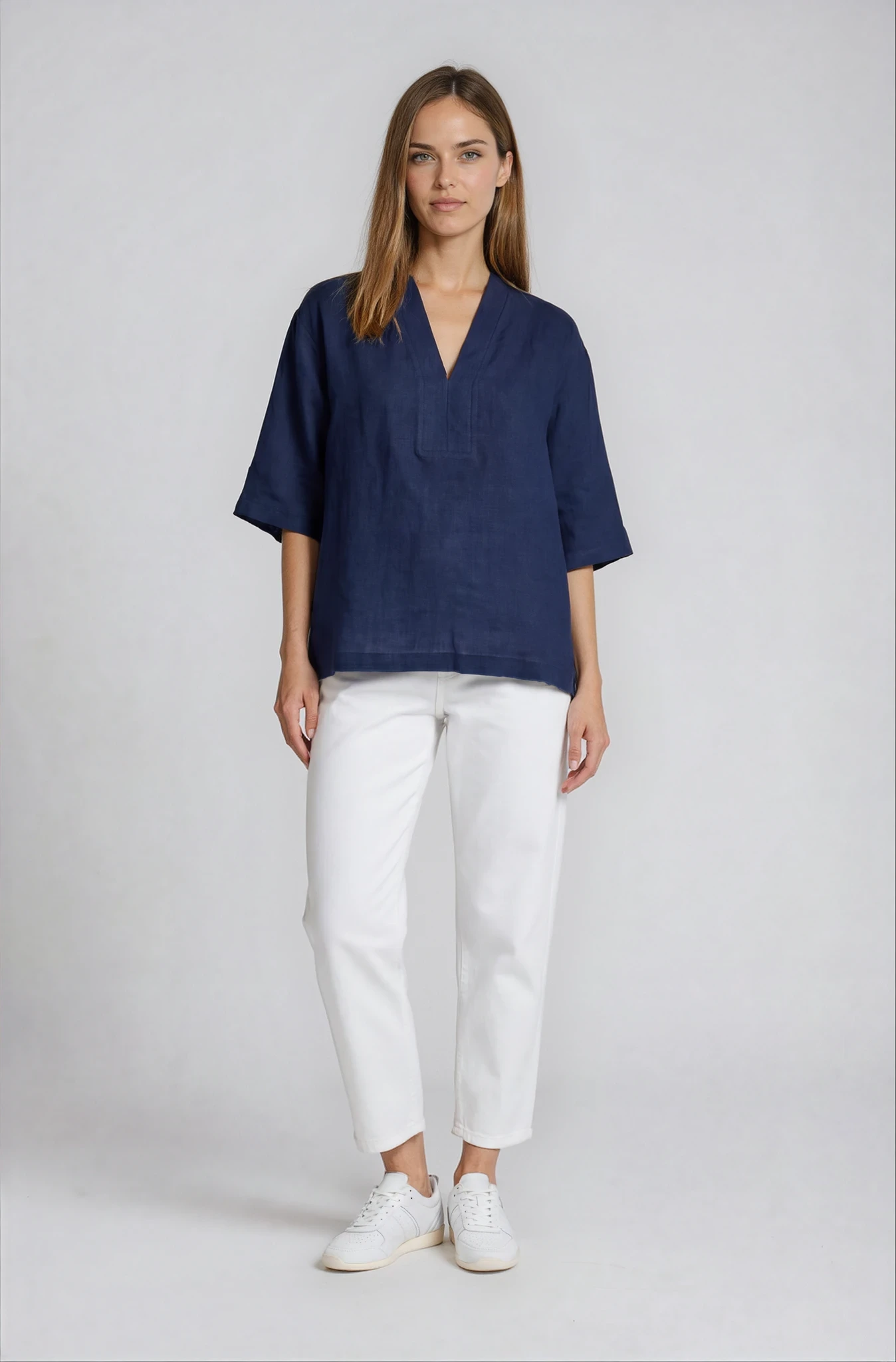 Tunica ampia con scollo a v, caratterizzata da spacchetti laterali. Le linee morbide definiscono una vestibilità gradevole, che si accompagna alla piacevolezza del tessuto in lino.