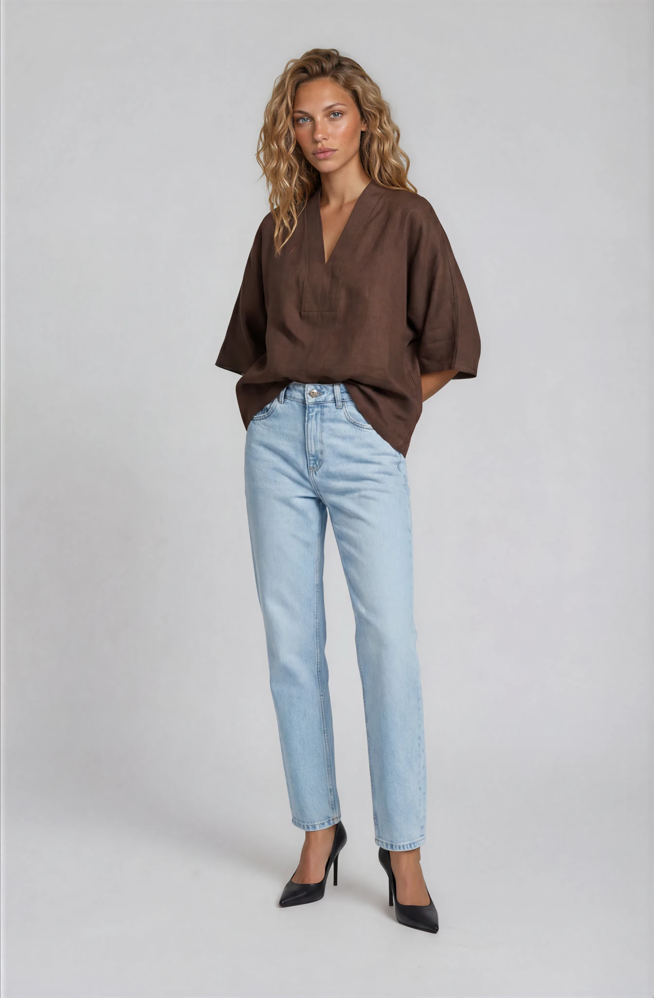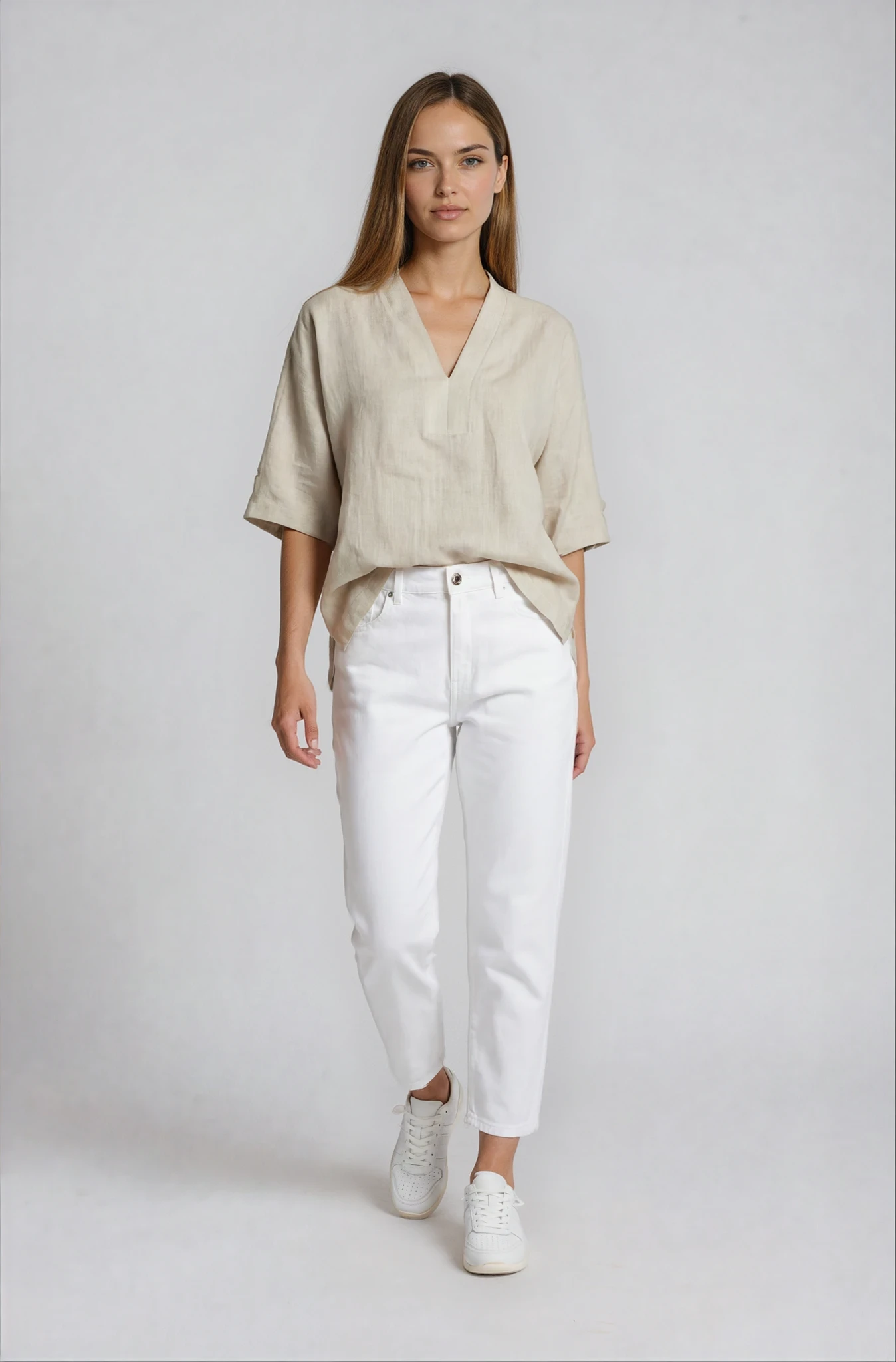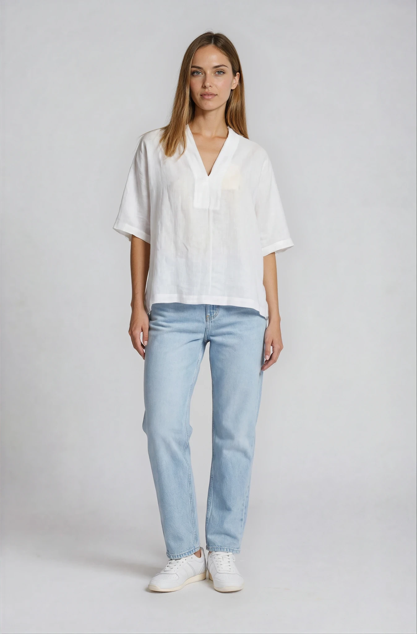 Tunica ampia con scollo a v, caratterizzata da spacchetti laterali. Le linee morbide definiscono una vestibilità gradevole, che si accompagna alla piacevolezza del tessuto in lino.